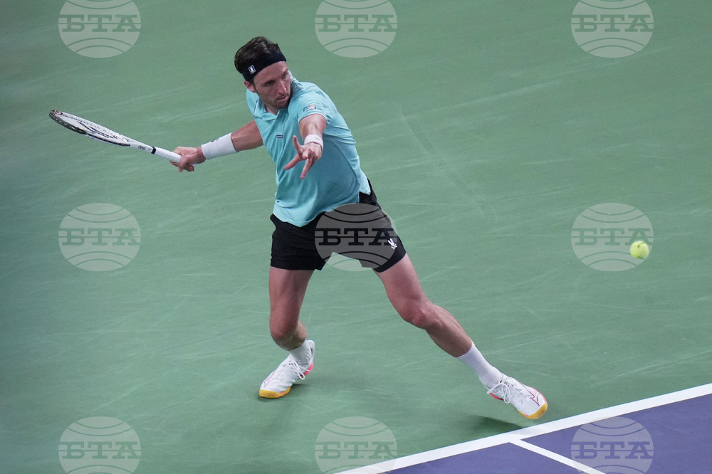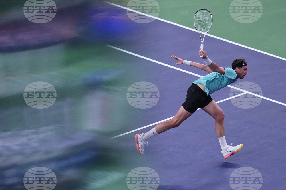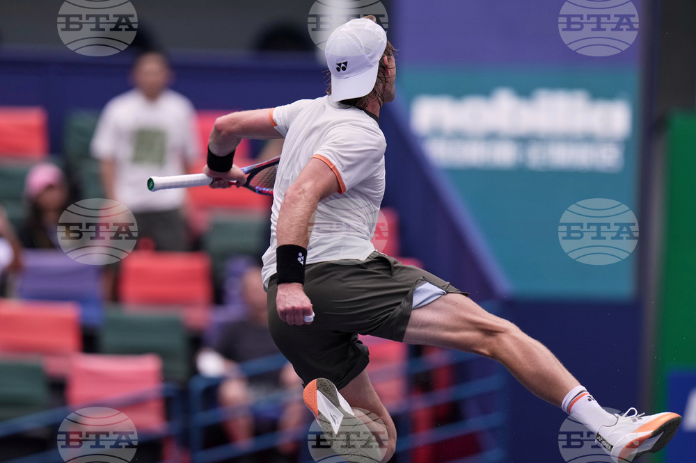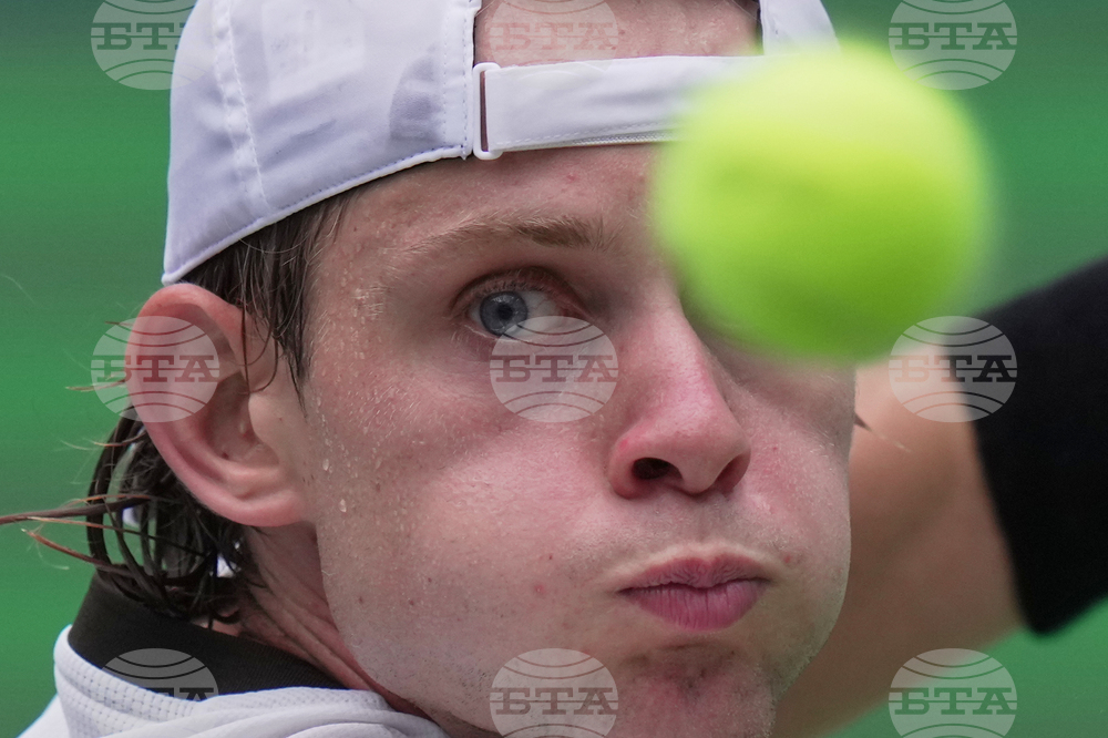 Zizou Bergs of Belgium returns a backhand shot from Gabriel Diallo, of Canada, during the men's singles match of the Shanghai Masters tennis tournament at Qizhong Forest Sports City Tennis Center, in Shanghai, China, Tuesday, Oct. 7, 2025. (AP Photo/Andy Wong)