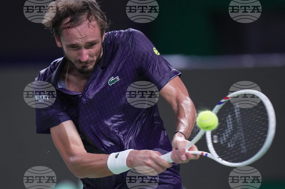 Russia's Daniil Medvedev watches his shot as he plays against Alejandro Davidovich Fokina of Spain during the men's singles match of the Shanghai Masters tennis tournament at Qizhong Forest Sports City Tennis Center, in Shanghai, China, Monday, Oct. 6, 2025. (AP Photo/Andy Wong)