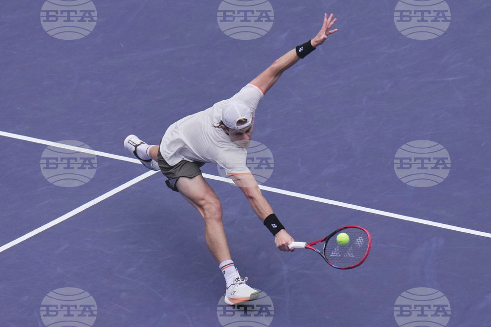 Arthur Rinderknech of France plays a backhand return to Alexander Zverev of Germany during the men's singles match of the Shanghai Masters tennis tournament at Qizhong Forest Sports City Tennis Center, in Shanghai, China, Monday, October. 6, 2025. (AP Photo/Andy Wong)