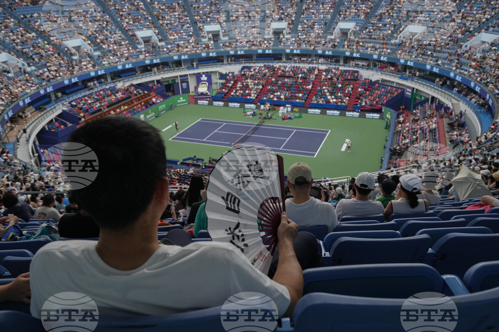 A spectator cools himself with a fan as he watches the men's singles match between Zizou Bergs, of Belgium, and Gabriel Diallo, of Canada, in the Shanghai Masters tennis tournament at Qizhong Forest Sports City Tennis Center, in Shanghai, China, Tuesday, Oct. 7, 2025. (AP Photo/Andy Wong)