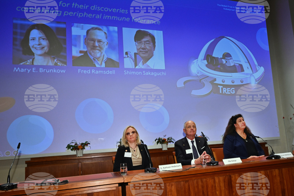 From left,Gunilla Karlsson Hedestam and Olle Kämpe, members of the Nobel Assembly at Karolinska Institutet, and Marie Wahren-Herlenius, Professor of Rheumatology Karolinska Institutet announce Mary E Brunkow, Fred Ramsdell and Shimon Sakaguchi as the recipients the Nobel Prize in Medicine or Physiology, at the Nobel Assembly of the Karolinska Institutet, in Stockholm, Sweden, Monday, Oct. 6, 2025. (Claudio Bresciani/TT News Agency via AP)