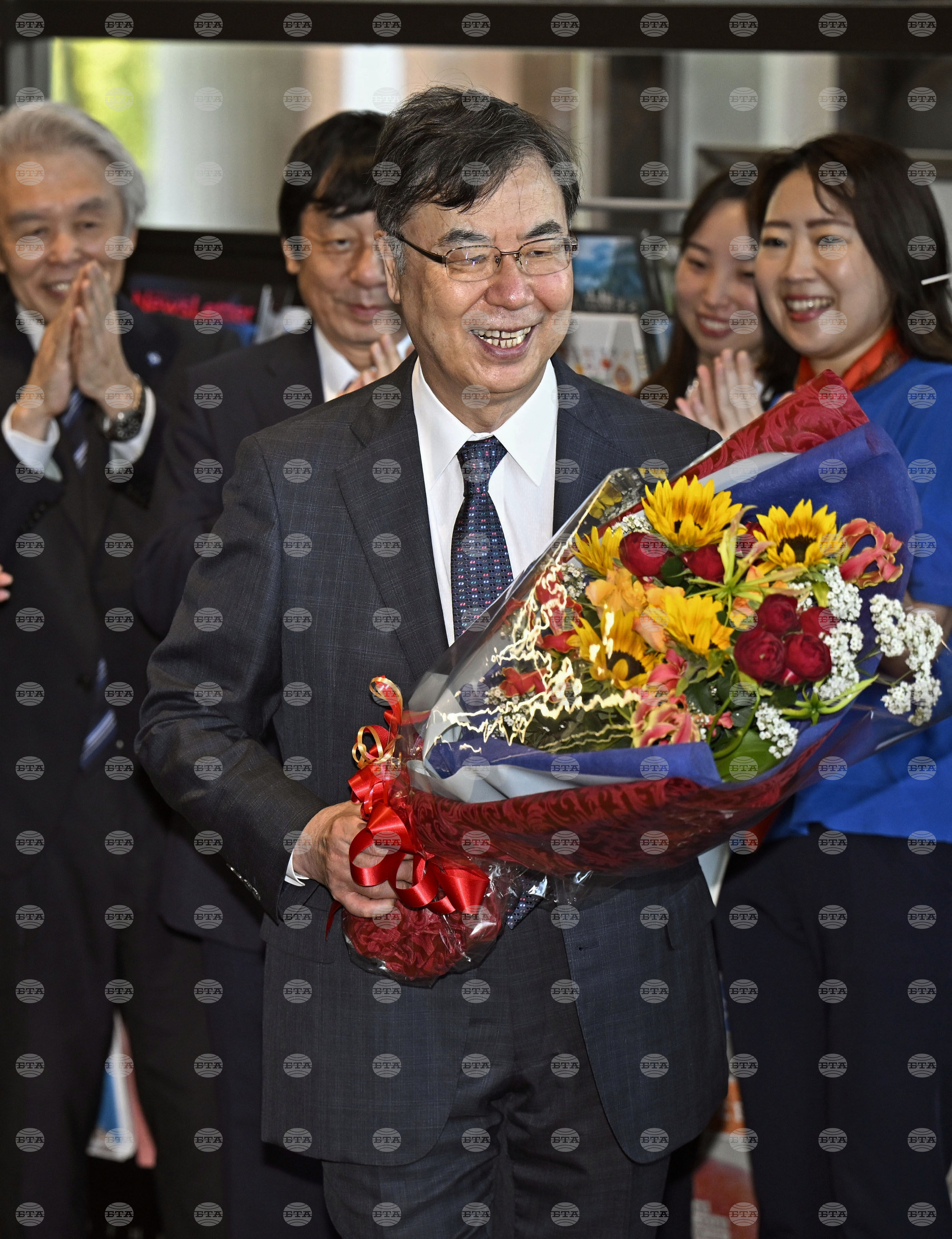 Osaka University professor Dr. Shimon Sakaguchi smiles as he receives flowers in Suita, near Osaka, western Japan, Tuesday, Oct. 7, 2025, a day after he won the Nobel Prize in medicine. (Yu Nakajiyama/Kyodo News via AP)