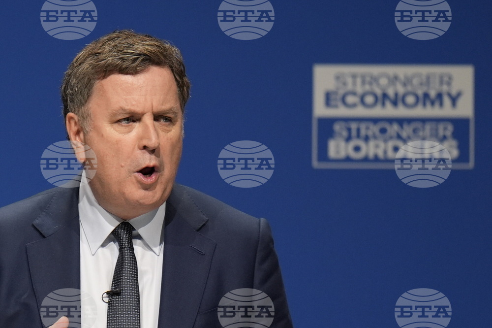 Shadow home secretary Chris Philp delivers a speech during the Conservative Party Conference at the Manchester Central Convention Complex, in Manchester, England, Tuesday Oct. 7, 2025. (Peter Byrne/PA via AP)