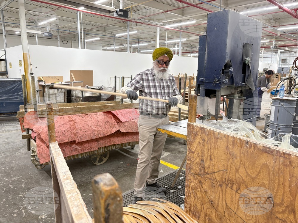 A worker makes wooden hockey sticks at the Roustan Hockey factory, which is the last major manufacturer of hockey sticks in Canada on Aug. 27, 2025 in Brantford, Ontario. (AP Photo/Kelvin Chan)