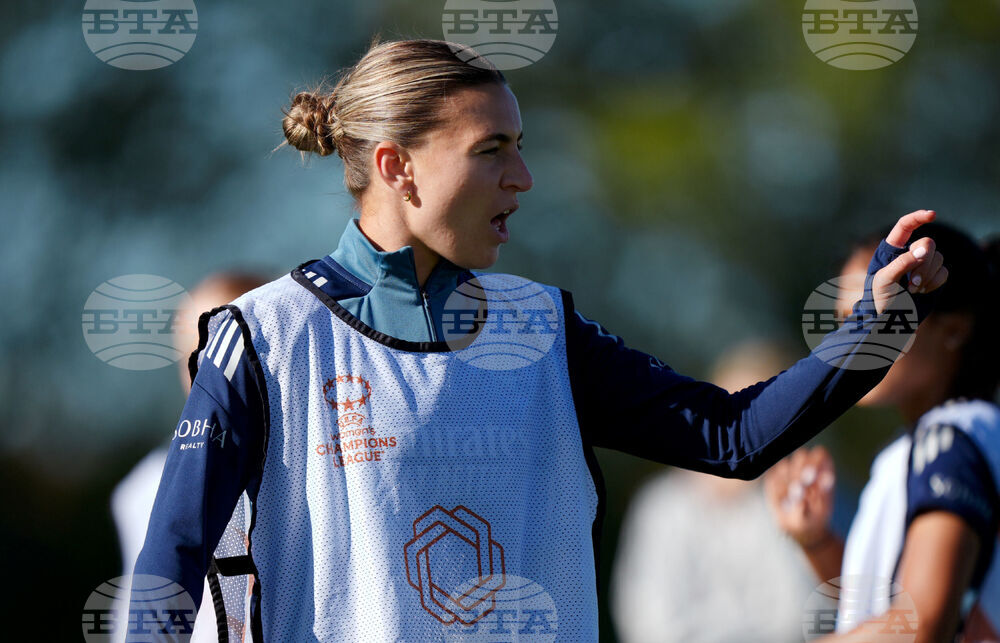 Arsenal's Steph Catley during a training session in London, England, Monday, Oct. 6, 2025 ahead of the Women's Champions League soccer match against OL Lyonnes. (Ben Whitley/PA via AP)