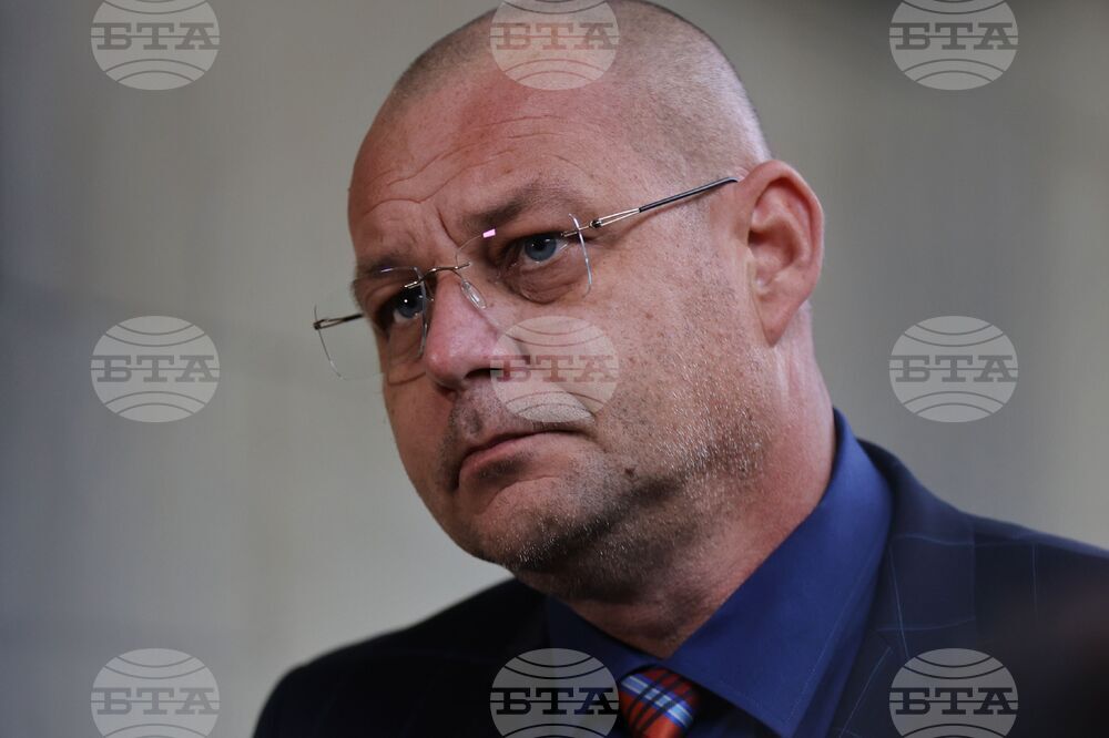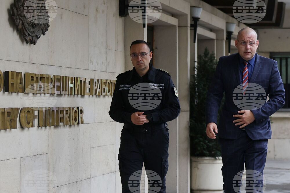 София (6 октомври 2025) Пред сградата на Министерството на вътрешните работи се провежда брифинг след проведеното заседание на Оперативният щаб на МВР във връзка с динамичната метеорологична обстановка в страната. На снимката: директорът на ГДПБЗН главен комисар Александър Джартов и директорът на Главна дирекция „Национална полиция" главен комисар Захари Васков (вдясно).