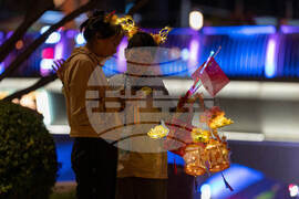 A mother and a child selling lanterns chat during mid-autumn festival in Beijing, Monday, Oct. 6, 2025. (AP Photo/Ng Han Guan)