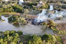 In this aerial view image taken from video from WCBD, smoke rises from a house fire on Edisto Island, S.C., on Oct. 4, 2025. (WCBD via AP)