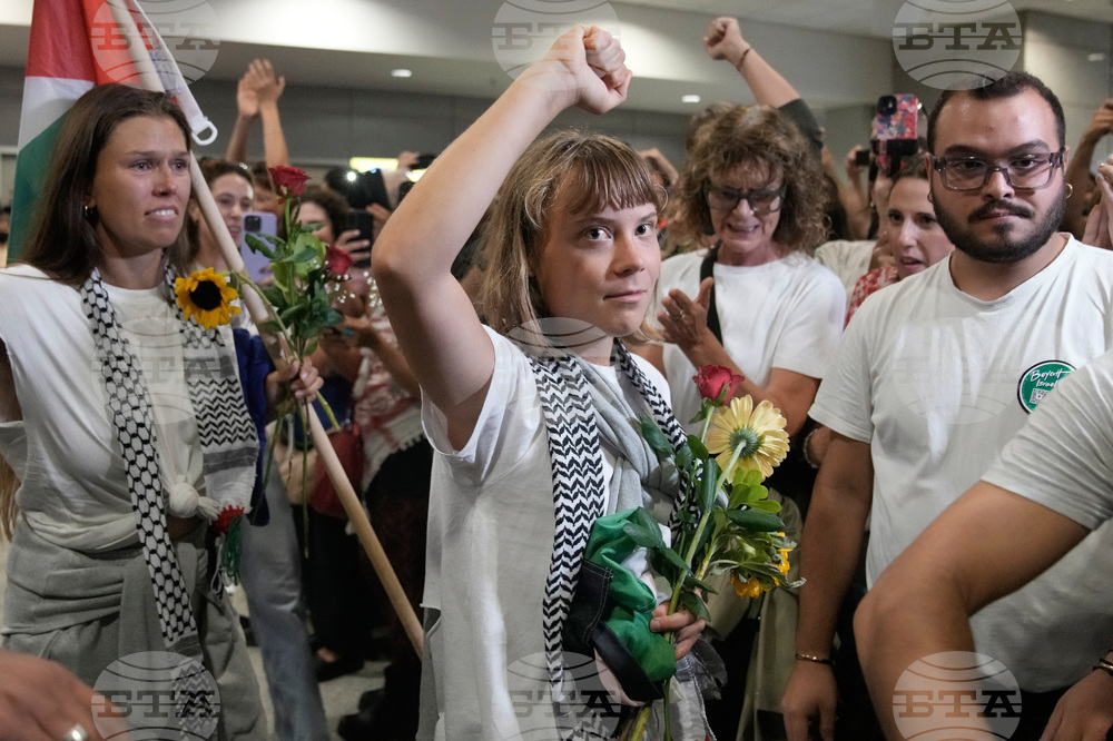 Swedish activist Greta Thunberg arrives at the Eleftherios Venizelos International Airport in Athens, Monday, Oct. 6, 2025 after being deported from Israel for taking part in a Gaza-bound aid flotilla. (AP Photo/Petros Giannakouris)
