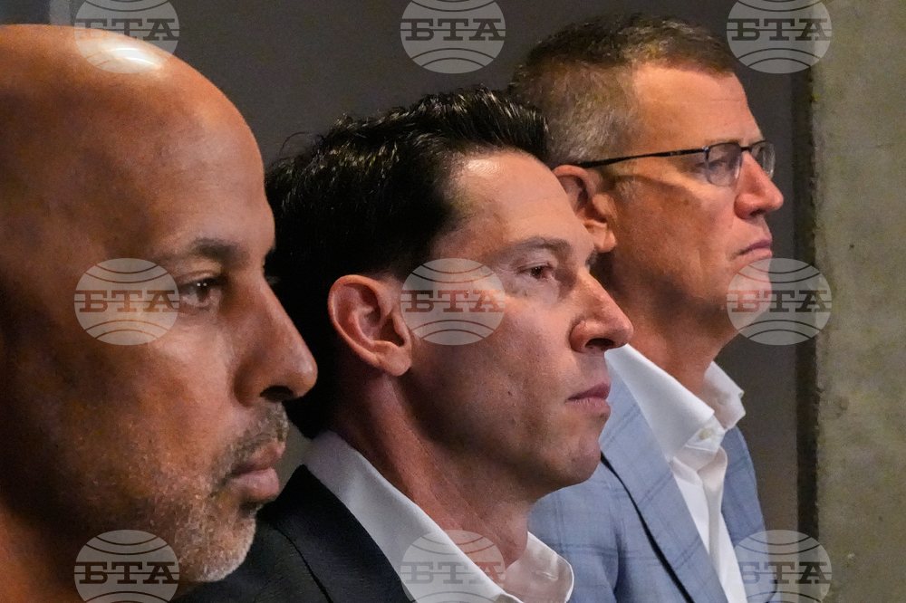Boston Red Sox Manager Alex Cora, Chief Baseball Officer Craig Breslow, President & CEO Sam Kennedy, from left, listen to a reporter's question at Fenway Park, Monday, Oct. 6, 2025, in Boston. (AP Photo/Charles Krupa)