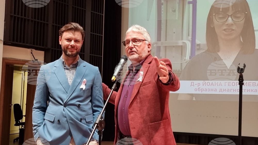 Враца (6 октомври 2025) Във Враца тази вечер беше открита кампанията „Розов октомври“, посветен на международния месец за борба с рака на гърдата. Кампанията се провежда съвместно между Община Враца, КОЦ Враца, МБАЛ „Сърце и мозък“ Плевен, с подкрепата на на Българското дружество за борба с рака на гърдата и клуба на жените мотористи Lady Bikers MPowered Bulgaria. Преди официалното откриване бяха пуснати розови балони в небето над Враца, а след това концерт изнесе Михаела Маринова. На снимката: д-р Иванов от МБАЛ „Сърце и мозък“ Плевен (вляво) и др- Стефанов от КОЦ Враца.