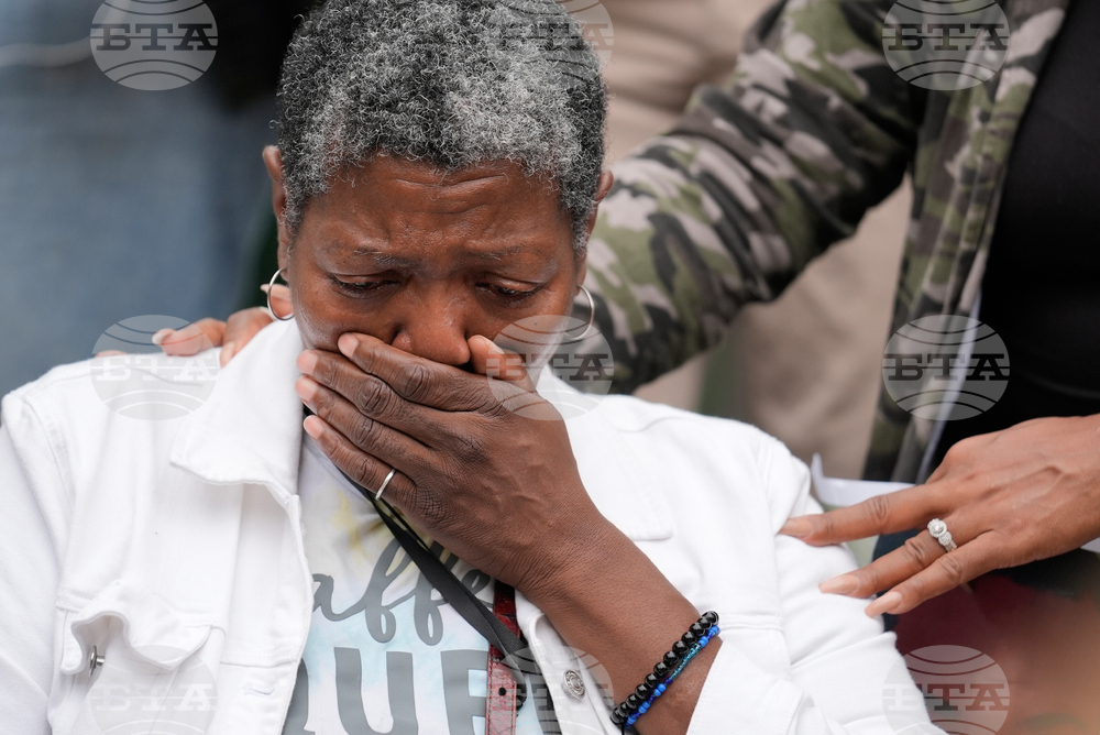 Lolita Griffeth, fiancé of Cornelius Taylor, cries during a rally at the Atlanta City Hall on Monday, Oct. 6, 2025, in Atlanta. (AP Photo/Brynn Anderson)