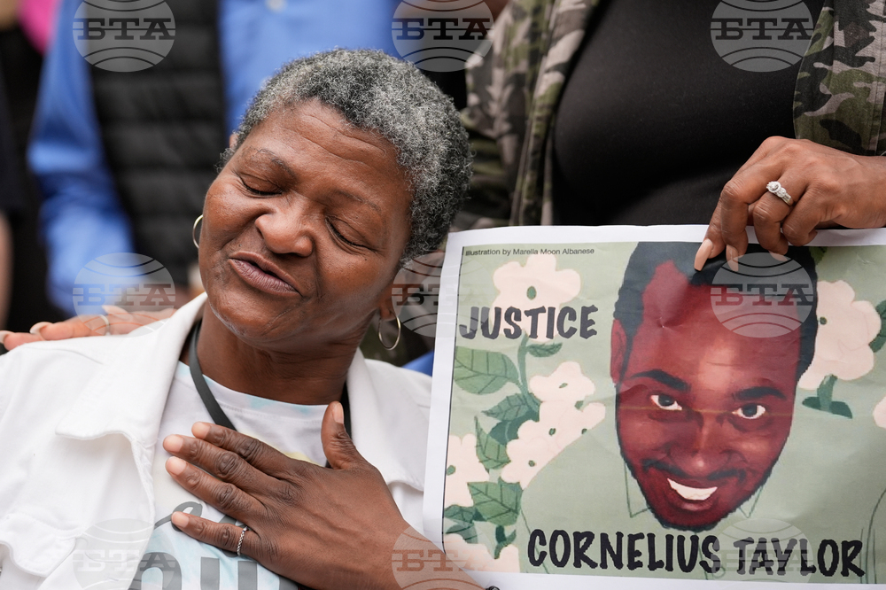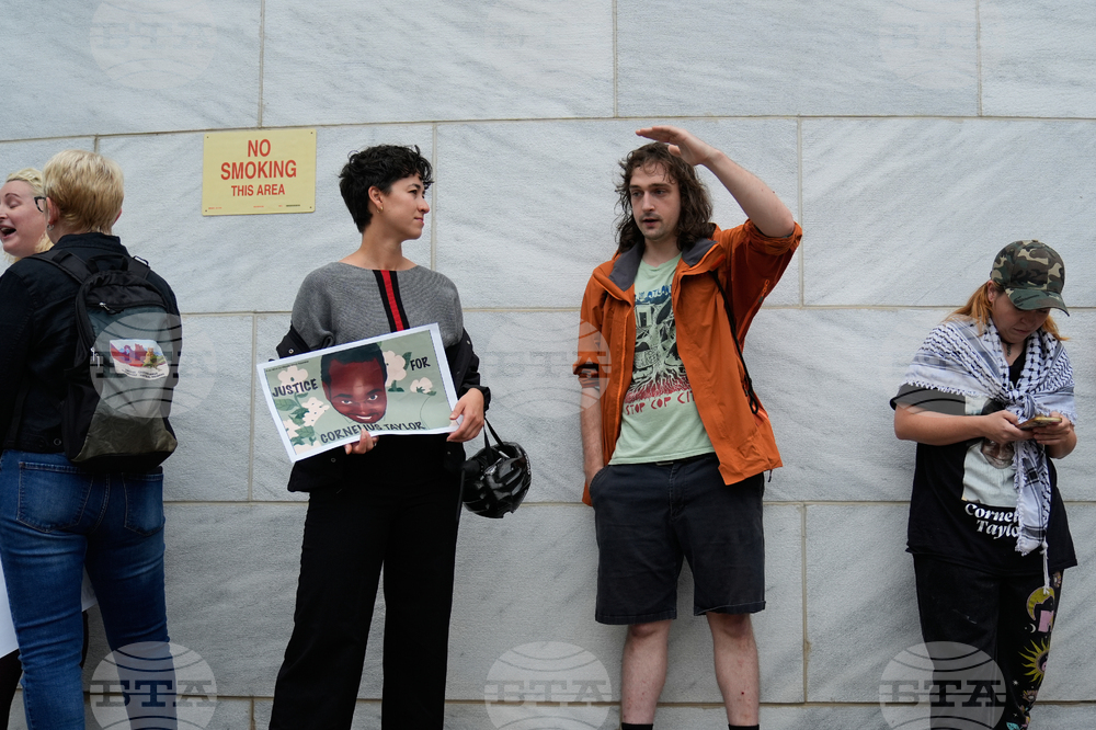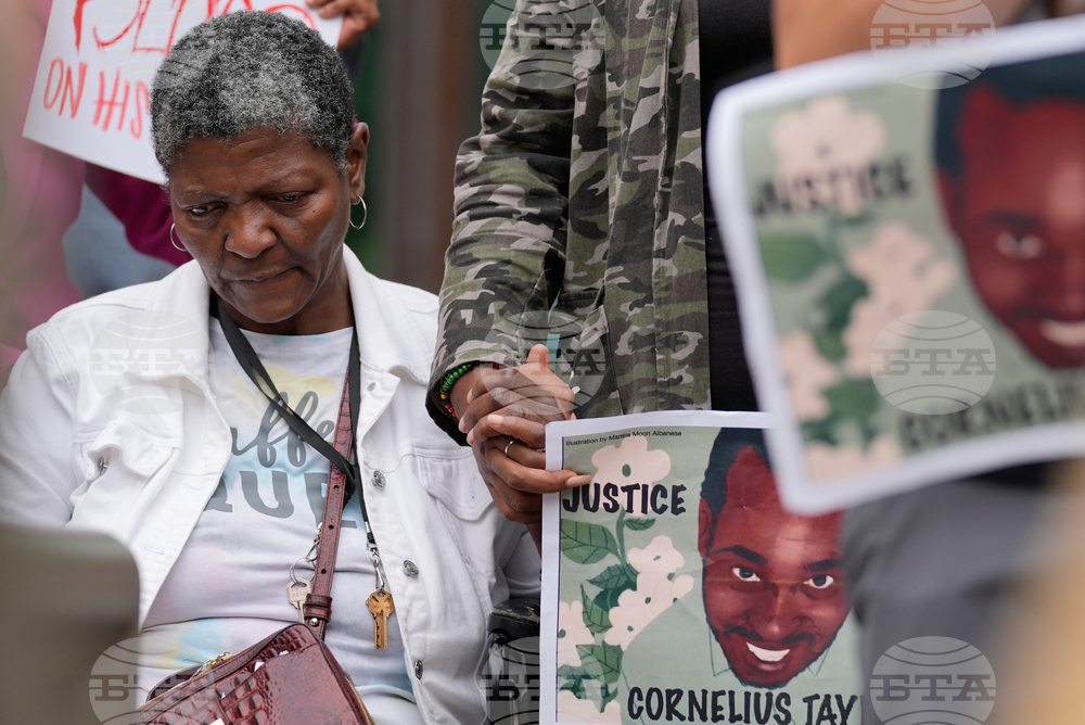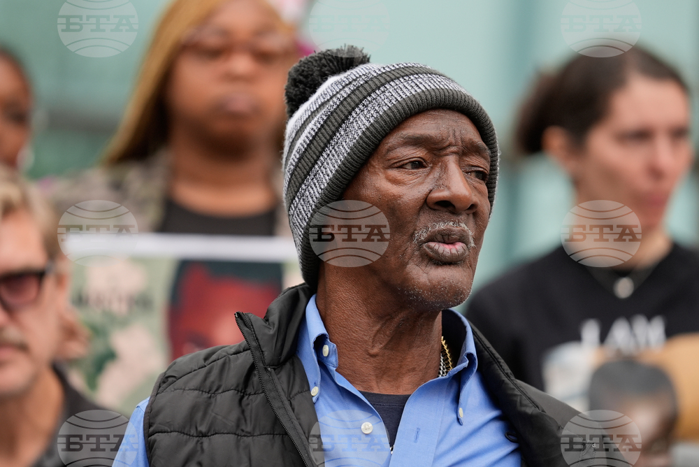 People gather for a rally for Cornelius Taylor at the Atlanta City Hall on Monday, Oct. 6, 2025, in Atlanta. Taylor, died after he was crushed by a bulldozer at a homeless encampment in January. (AP Photo/Brynn Anderson)