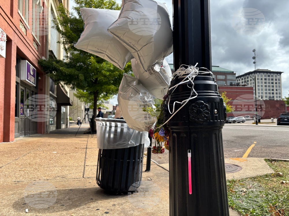 Star-shaped balloons and flowers were tied to street lights in downtown Montgomery, Ala., on Oct. 6, 2025 at the site of a mass shooting that killed two people and wounded a dozen others. (Kim Chandler/Associated Press)