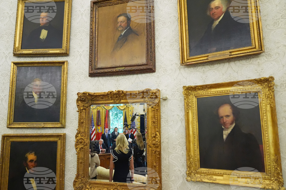 As reflected in a mirror, President Donald Trump speaks to reporters before signing an executive order in the Oval Office at the White House, Monday, Oct. 6, 2025, in Washington. (AP Photo/Jacquelyn Martin)