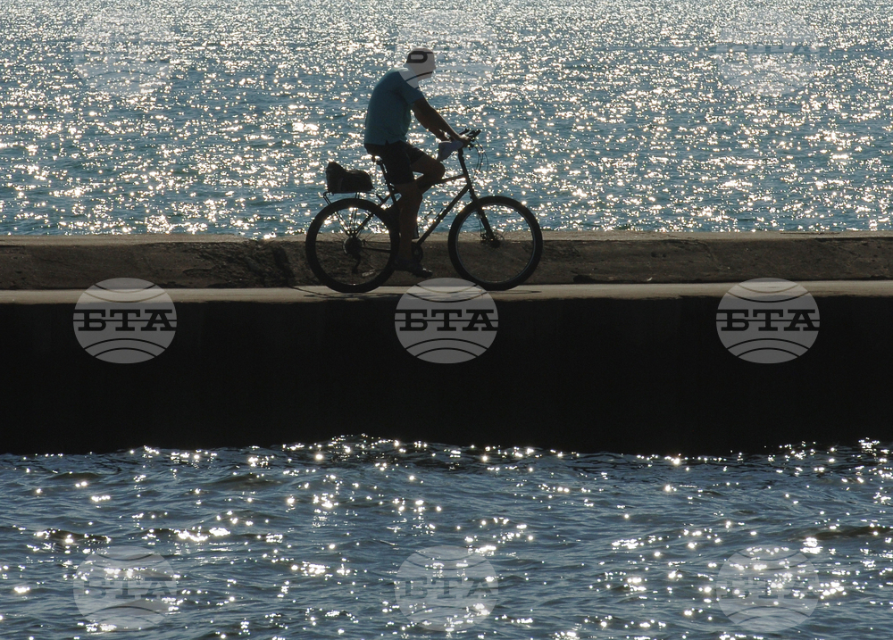 The sun reflects off Lake Michigan as a cyclist cruises along the South Pier Monday, Oct. 6, 2025, in St. Joseph, Mich. (Don Campbell/The Herald-Palladium via AP)