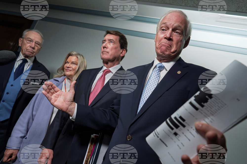 From left, Sen. Bill Hagerty, R-Tenn., Senate Judiciary Committee Chairman Chuck Grassley, R- Iowa, Sen. Tommy Tuberville, R-Ala., and Sen. Ron Johnson, R-Wis., chairman of the Permanent Subcommittee on Investigations, speak with reporters as they make an announcement about their oversight of the FBI, at the Capitol in Washington, Monday, Oct. 6, 2025. (AP Photo/J. Scott Applewhite)