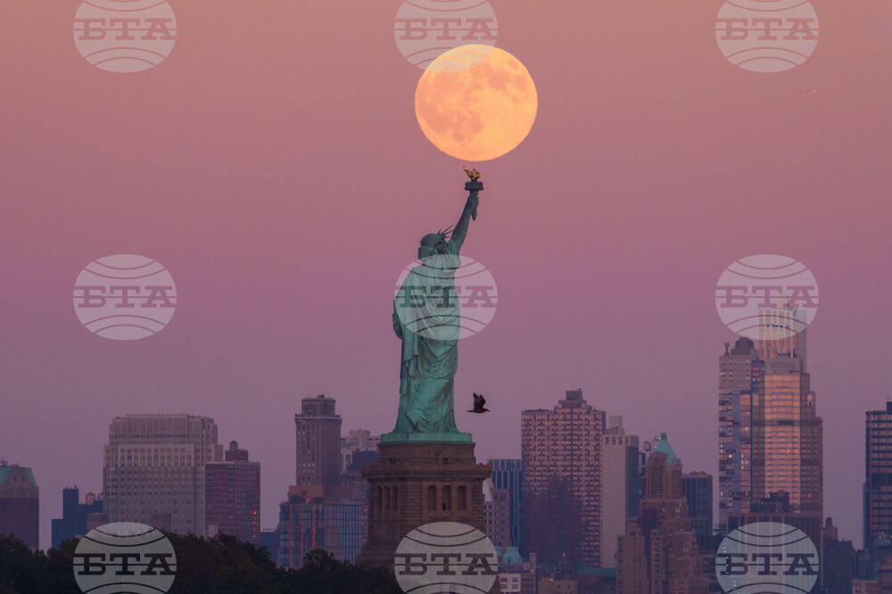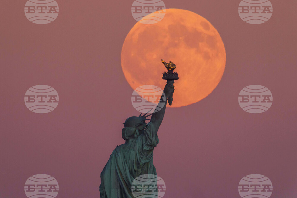 The Harvest Supermoon rises behind the Statue of Liberty and the Brooklyn skyline, Monday, Oct. 06, 2025, in New Jersey. (AP Photo/Adam Gray)