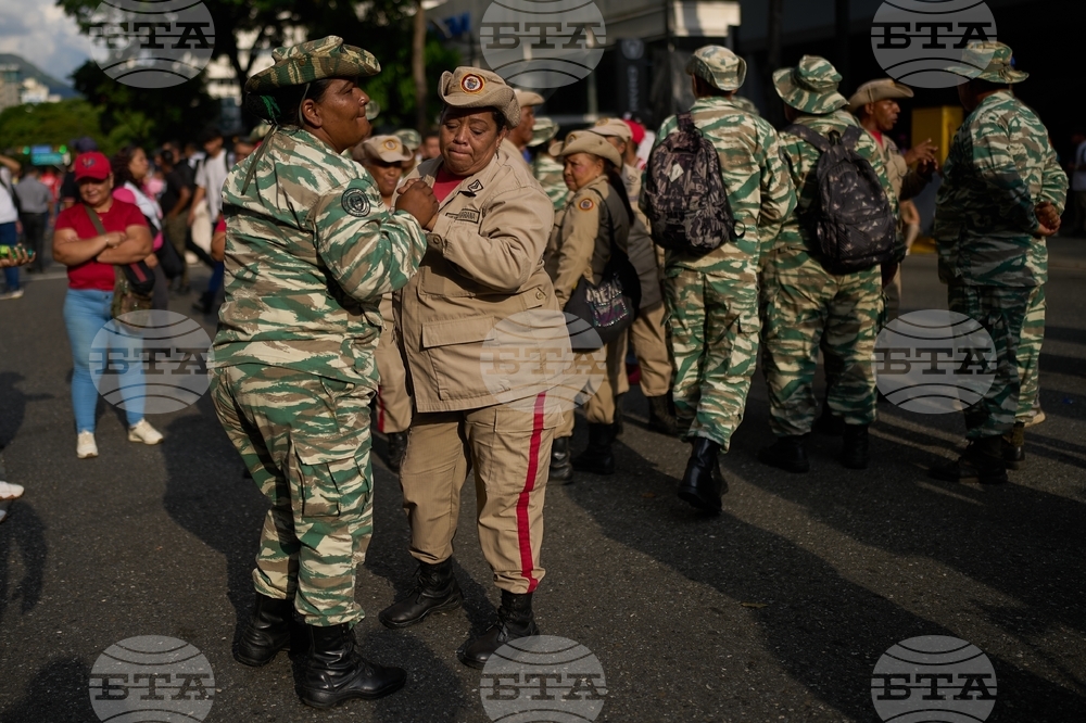 Bolivarian Militia members dance outside of the United Nations' office in Caracas, Venezuela, during a government-organized rally against foreign interference on Monday, Oct. 6, 2025. (AP Photo/Ariana Cubillos)