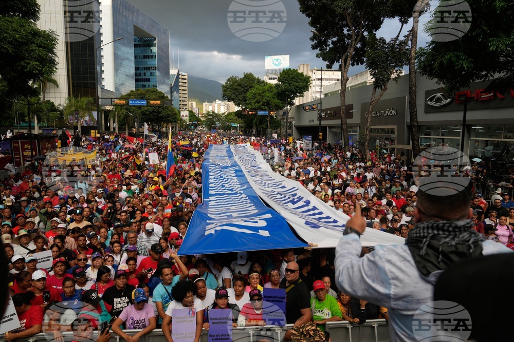 People gather outside of the United Nations' office in Caracas, Venezuela, for a government-organized rally against foreign interference on Monday, Oct. 6, 2025. (AP Photo/Ariana Cubillos)