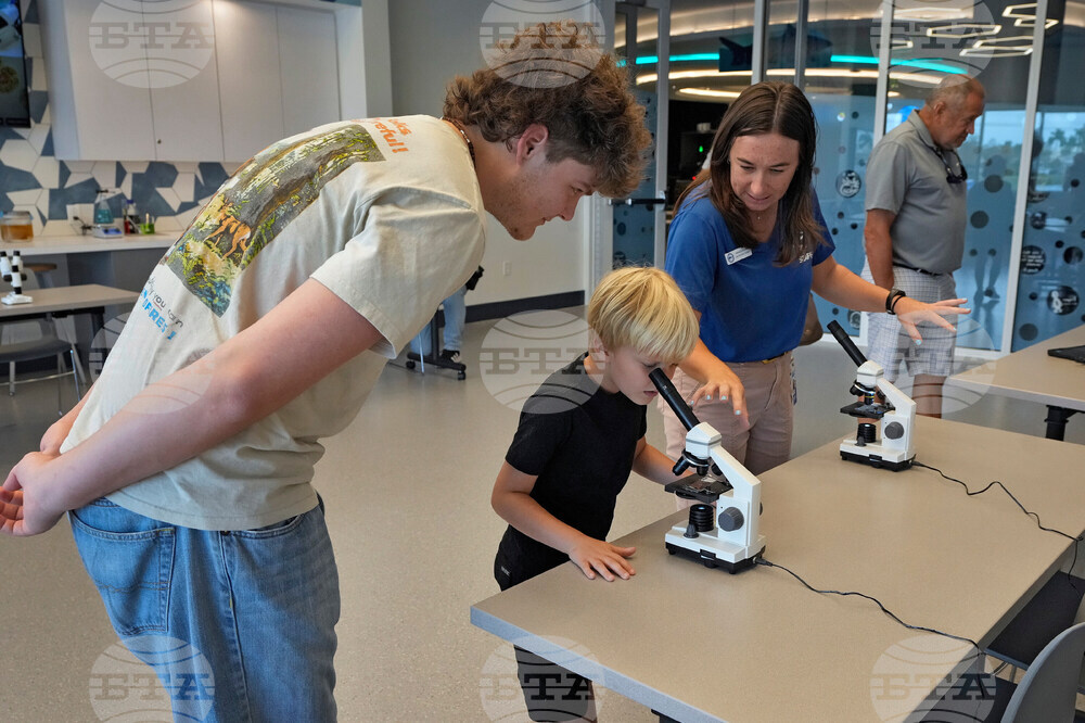 Staff member Amanda Shuman, second from right, instructs visitors using microscopes in the biomedical and immunology teaching laboratory at the Mote Science Education Aquarium, Monday, Oct. 6, 2025, in Sarasota, Fla. (AP Photo/Chris O'Meara)