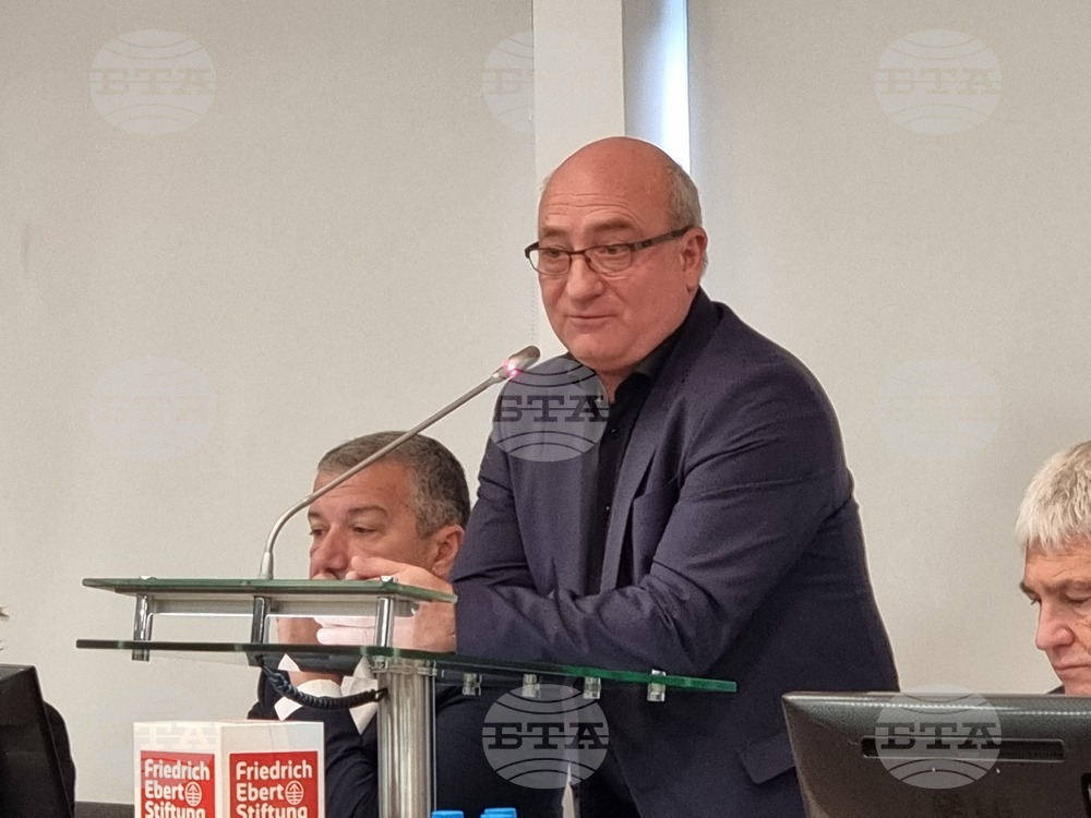 София (7 октомври 2025) КНСБ организира конференция "Време за равносметка: С тази данъчна система дотук!". На снимката (от ляво надясно): президентът на КНСБ Пламен Димитров и директорът на фондация "Фридрих Еберт" Жак Папаро.