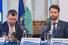 Габрово (7 октомври 2025) В Габрово започна регионална дискусия, част от националната информационна кампания на Министерството на финансите и Българската народна банка за въвеждане на еврото в България. На снимката (от ляво надясно): заместник-министърът на финансите Методи Методиев и Пламен Константинов, Министерство на финансите.