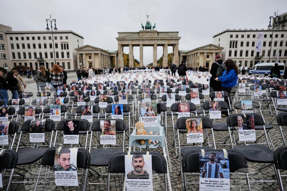 More than 1,000 chairs with photos of the murdered victims were set up on Pariser Platz in front of the Brandenburg Gate to commemorate the second anniversary of Hamas' terrorist attack on Israel, in Berlin, Germany, Tuesday, Oct. 7, 2025. (AP Photo/Markus Schreiber)