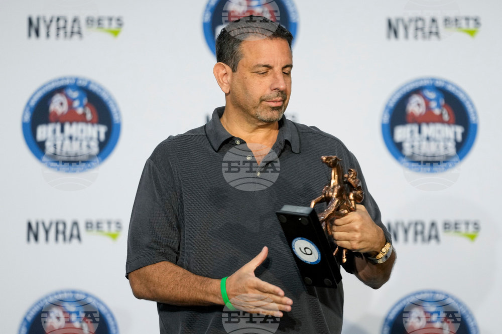 FILE - Co-owner Mike Repole randomly selects sixth position for the entrant Forte during a drawing for post positions ahead of the Belmont Stakes horse race, Tuesday, June 6, 2023, at Belmont Park in Elmont, N.Y. (AP Photo/John Minchillo,File)