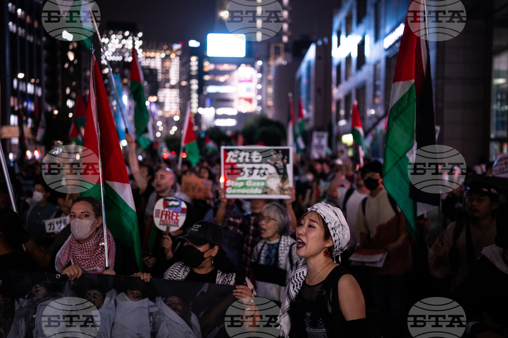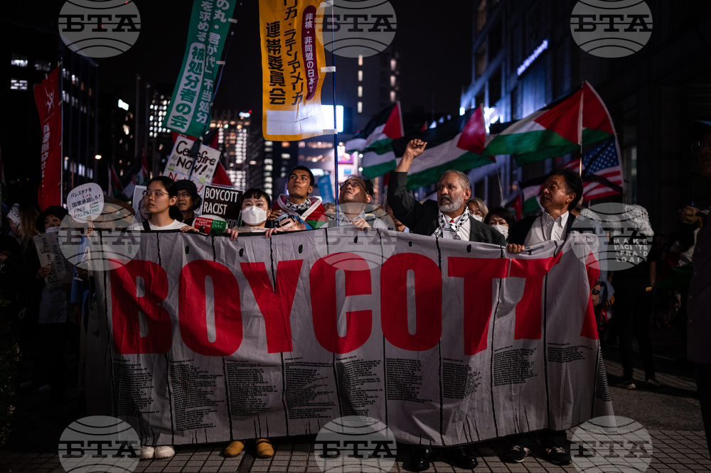 Demonstrators hold banners during a protest in support of Palestinians, in Tokyo, Tuesday, Oct 7, 2025. (AP Photo/Louise Delmotte)
