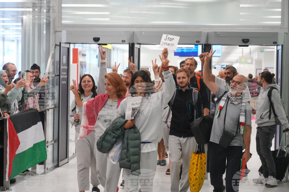 Activist Rima Hassan, center, and other French nationals arrive at Orly airport after being deported from Israel for taking part in a Gaza-bound aid flotilla, Tuesday, Oct. 7, 2025, south of Paris. (AP Photo/Thibault Camus)