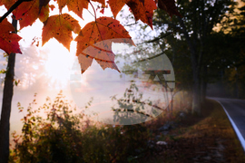 Maple leaves turn to fall foliage colors at sunrise along a country road, Tuesday, Oct. 7, 2025, in Auburn, N.H. (AP Photo/Charles Krupa)
