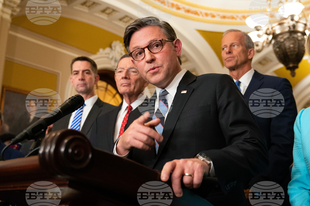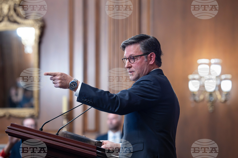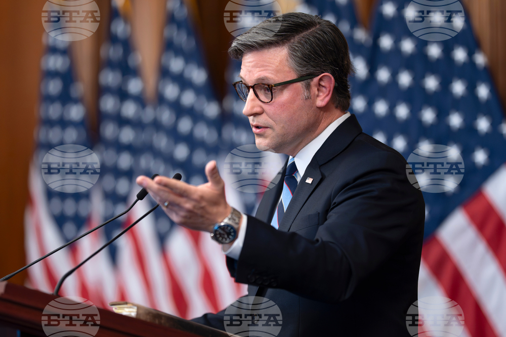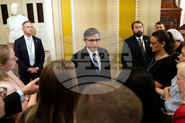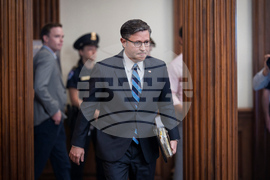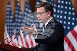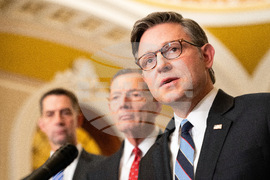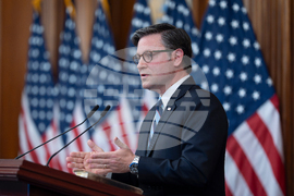 Speaker of the House Mike Johnson, R-La., center, holds press conference with other Republican Congressional members on 8th day of government shutdown at the U.S. Capitol on Wednesday, Oct. 8, 2025, in Washington. (AP Photo/John McDonnell)