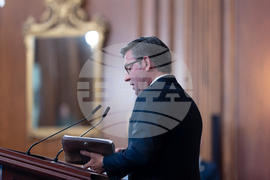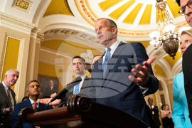 Senate Majority Leader John Thune, R-S.D., speaks to reporters following the weekly Senate policy luncheon on Capitol Hill in Washington, Tuesday, Oct. 7, 2025. (AP Photo/Allison Robbert)