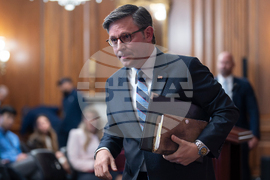 Speaker of the House Mike Johnson, R-La., joins a closed-door Senate Republican strategy session as the government shutdown heads toward a second week, at the Capitol in Washington, Tuesday, Oct. 7, 2025. (AP Photo/J. Scott Applewhite)