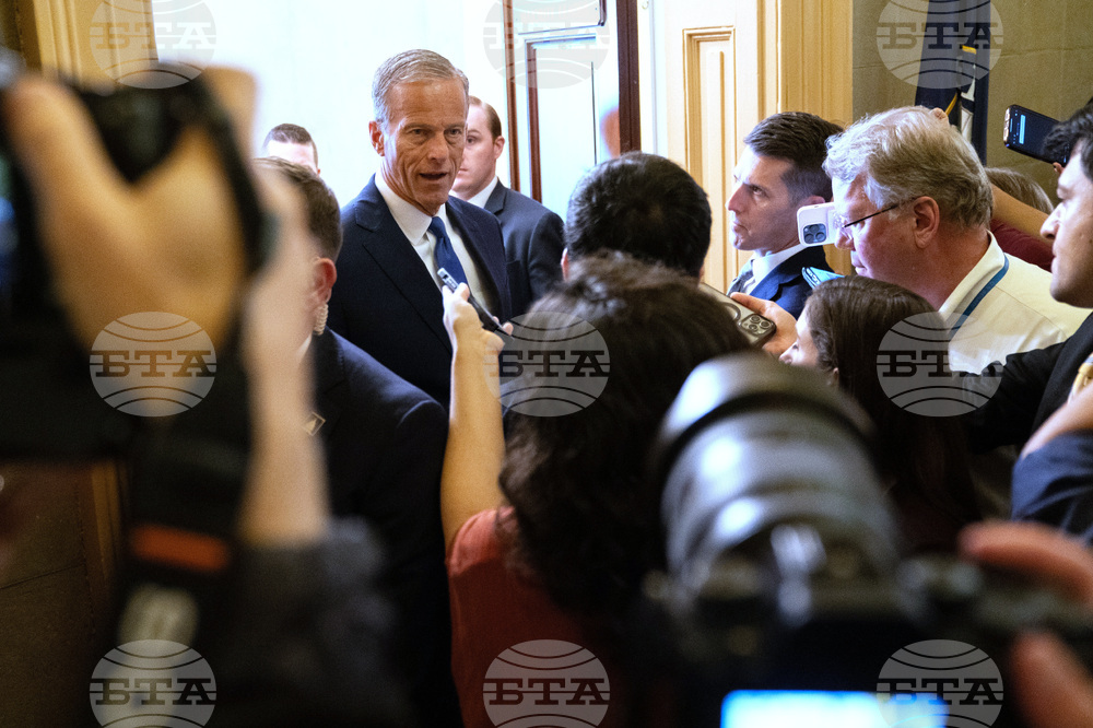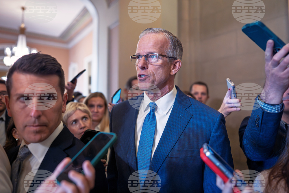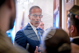 Senate Majority Leader John Thune, R-S.D., pauses to speak with reporters outside his office after opening the chamber on the seventh day of the government shutdown, at the Capitol in Washington, Tuesday, Oct. 7, 2025. (AP Photo/J. Scott Applewhite)