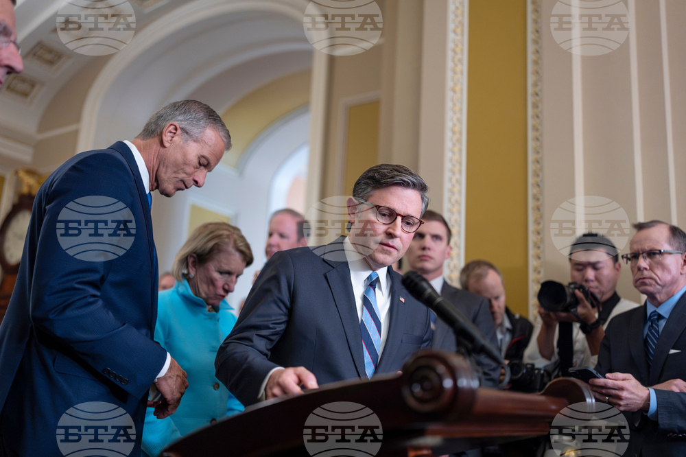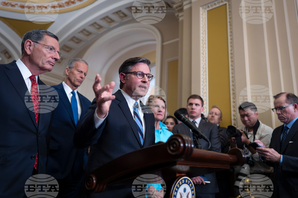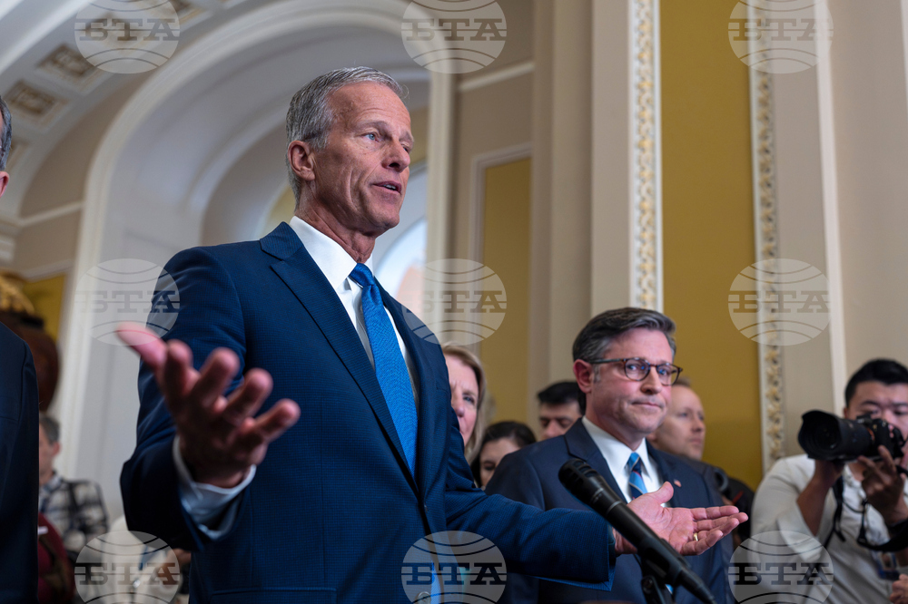 Senate Majority Leader John Thune, R-S.D., is joined by Speaker of the House Mike Johnson, R-La., right, as they speak with reporters following a closed-door Republican strategy session as the government shutdown heads toward a second week, at the Capitol in Washington, Tuesday, Oct. 7, 2025. (AP Photo/J. Scott Applewhite)