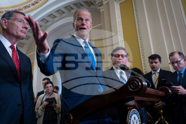 Senate Majority Leader John Thune, R-S.D., left, is joined by Speaker of the House Mike Johnson, R-La., center, at a news conference following a closed-door Republican strategy session as the government shutdown heads toward a second week, at the Capitol in Washington, Tuesday, Oct. 7, 2025. (AP Photo/J. Scott Applewhite)
