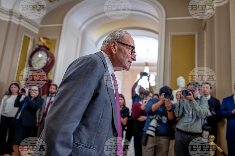 Senate Minority Leader Chuck Schumer, D-N.Y., arrives to talk with reporters as the government shutdown heads toward a second week, at the Capitol in Washington, Tuesday, Oct. 7, 2025. (AP Photo/J. Scott Applewhite)