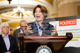 Sen. Amy Klobuchar, D-N.Y., speaks to reporters following the weekly Senate policy luncheon on Capitol Hill in Washington, Tuesday, Oct. 7, 2025. (AP Photo/Allison Robbert)