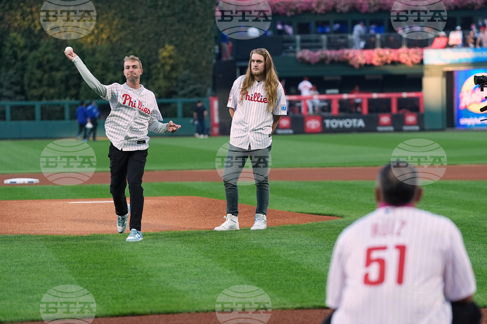 Braden Halladay, left, accompanied by his brother Matt Halladay, throws a ceremonially first pitch to former Philadelphia Phillies catcher Carlos Ruiz, marking the 15th anniversary of their father Roy Halladay's postseason no-hitter, ahead of Game 2 of baseball's National League Division Series between the Phillies and the Los Angeles Dodgers, Monday, Oct. 6, 2025, in Philadelphia. (AP Photo/Matt Rourke)