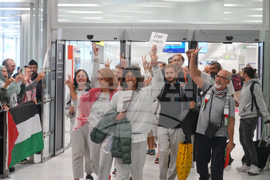 Activist Rima Hassan, center, and other French nationals arrive at Orly airport after being deported from Israel for taking part in a Gaza-bound aid flotilla, Tuesday, Oct. 7, 2025, south of Paris. (AP Photo/Thibault Camus)