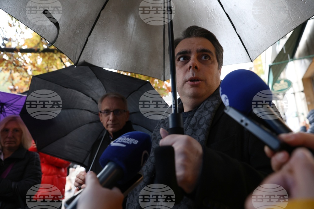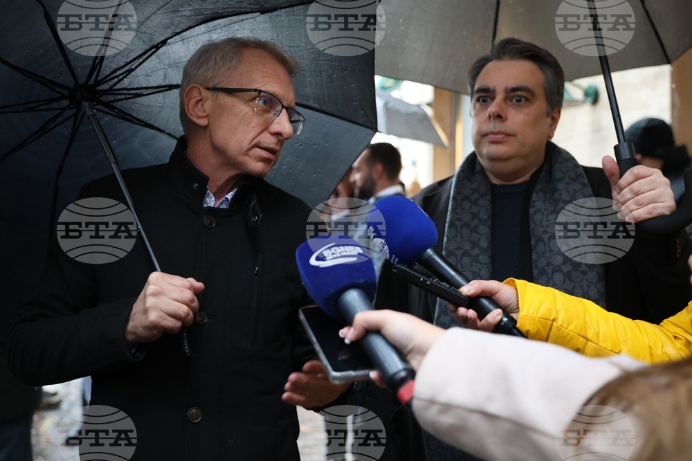 София (7 октомври 2025) Пред сградата на Министерство на здравеопазването се провежда протест на млади лекари. На снимката: бившият премиер Николай Денков и председателят на „Продължаваме промяната" Асен Василев (вдясно).