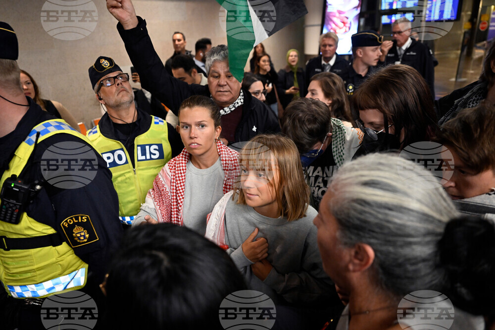 Greta Thunberg and other activists from the Global Sumud Flotilla arrive at Arlanda Airport, Stockholm, Sweden, Tuesday, Oct. 7, 2025. (Fredrik Sandberg/TT News Agency via AP)