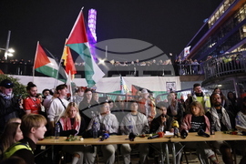 Greta Thunberg and other activists from the Global Sumud Flotilla arrive at Arlanda Airport, Stockholm, Sweden, Tuesday, Oct. 2, 2025. (Fredrik Sandberg/TT News Agency via AP)