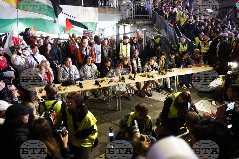 Greta Thunberg and activists from the Global Sumud Flotilla hold a press conference arranged by the Global Movement to Gaza Sweden in central Stockholm, Tuesday, Oct. 7, 2025. (Caisa Rasmussen/TT via AP)