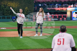 CORRECTS FIRST NAME TO RYAN, NOT MATT - Braden Halladay, left, accompanied by his brother Ryan Halladay, throws a ceremonially first pitch to former Philadelphia Phillies catcher Carlos Ruiz, marking the 15th anniversary of their father Roy Halladay's postseason no-hitter, ahead of Game 2 of baseball's National League Division Series between the Phillies and the Los Angeles Dodgers, Monday, Oct. 6, 2025, in Philadelphia. (AP Photo/Matt Rourke)