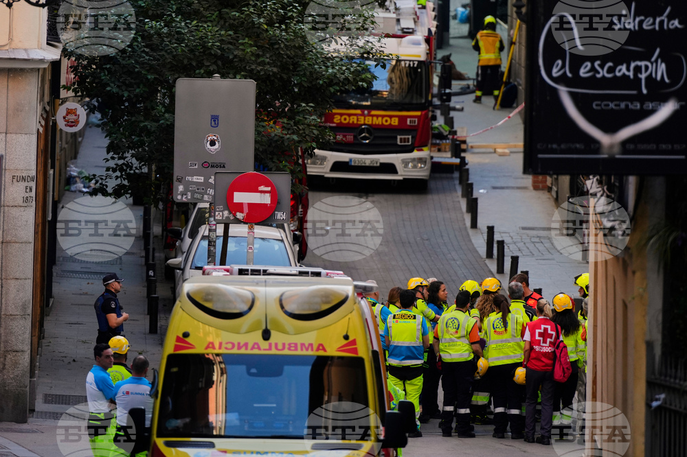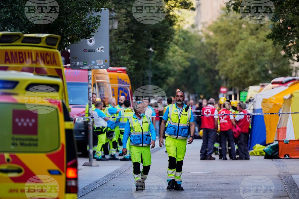 Emergency personnel work on the scene of a building collapse in Madrid, Spain, on Tuesday, Oct. 7, 2025. (AP Photo/Manu Fernandez)
