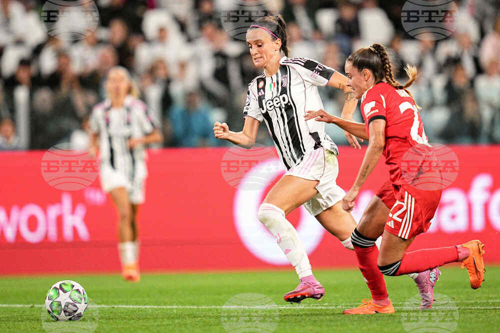 Juventus' Barbara Bonansea, left, fights for the ball with Benfica's Diana Gomes during the Women's Champions League soccer match between Juventus FC W and S.L. Benfica at the Allianz Stadium in Turin, Italy, Tuesday, Oct. 7, 2025. (Marco Alpozzi/LaPresse via AP)