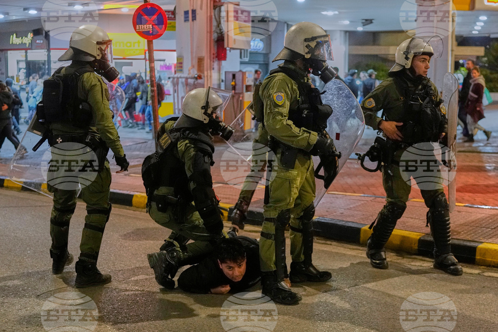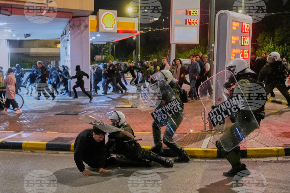 Riot police arrest a protester during a pro-Palestinian demonstration outside the embassy of Israel in Athens, Tuesday, Oct. 7, 2025, marking the two-year anniversary of Hamas' attack on Israel. (AP Photo/Petros Giannakouris)